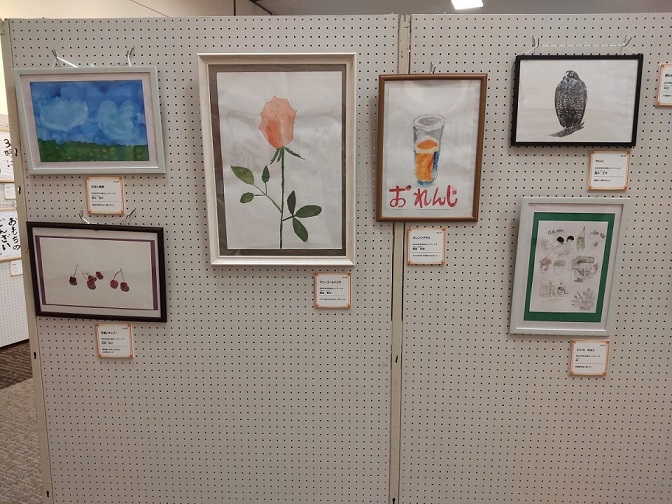 ホール内一杯に各事業所に通所している方々の作品(書道や絵画、高作品、キルト作品等)が展示されており、