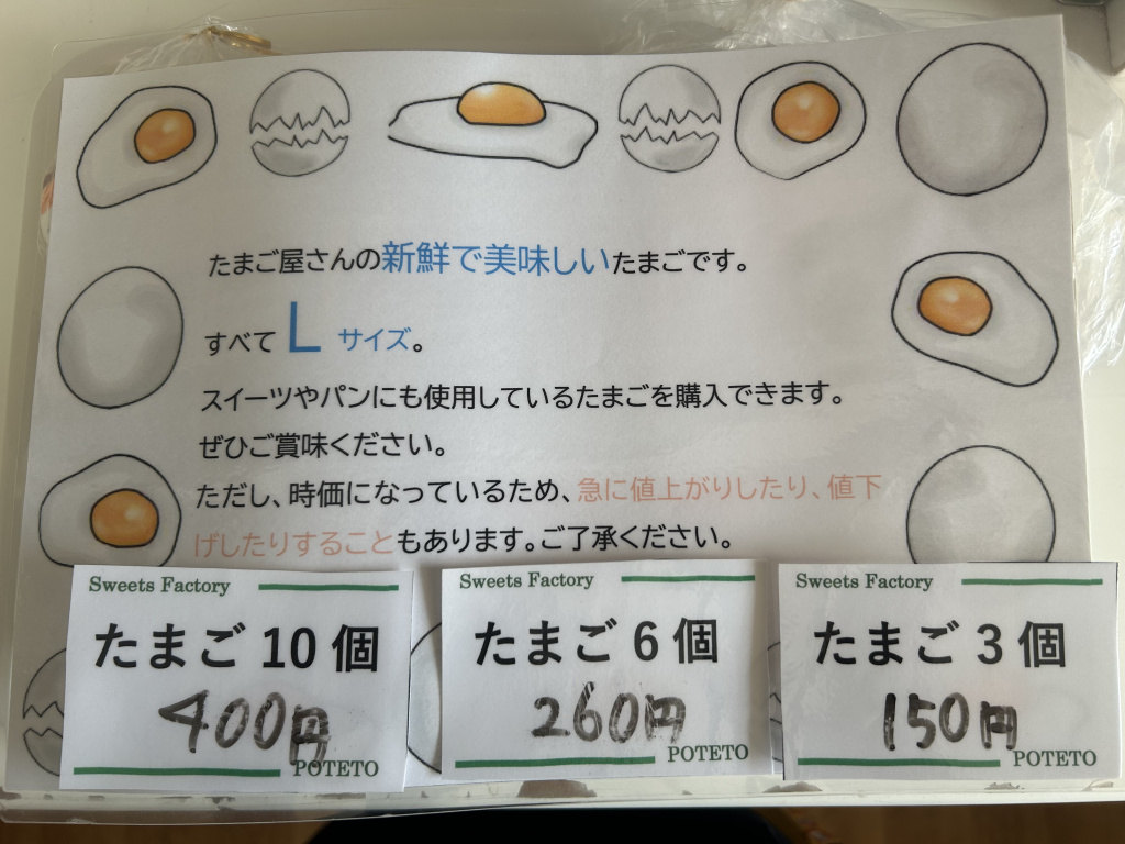 たまご・牛乳の販売開始!! 2025, 11月 25th, 火曜日 at 11:51 AM. こんにちは。Caféぽてとです。 この度、Caféぽてとでたまごと牛乳の販売を開始しました✨ たまごは3個(150円)、6個(260円)、10個(400円)での販売です。たまご屋さんの新鮮で美味しいたまごです! 牛乳は1L(300円)で、当店のシュークリームのカスタードに使用しているものです♡ ぜひ、お買い求めください。ご来店お待ちしております✨